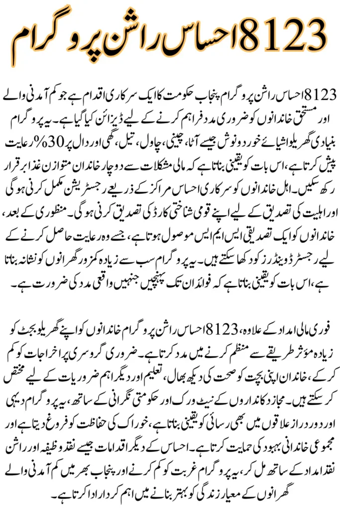 The 8123 Ehsaas Rashan Program is a social welfare initiative launched by the Punjab Government to support low-income and deserving families. This program provides a significant discount on essential household groceries, helping families cope with rising food costs.