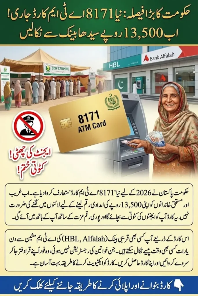 The BISP 8171 ATM Card is a financial aid card launched by the Government of Pakistan in 2026. It allows eligible low-income families to receive their monthly payments of Rs. 13,500 directly through ATMs and partner banks, ensuring easy, transparent, and timely access to funds.