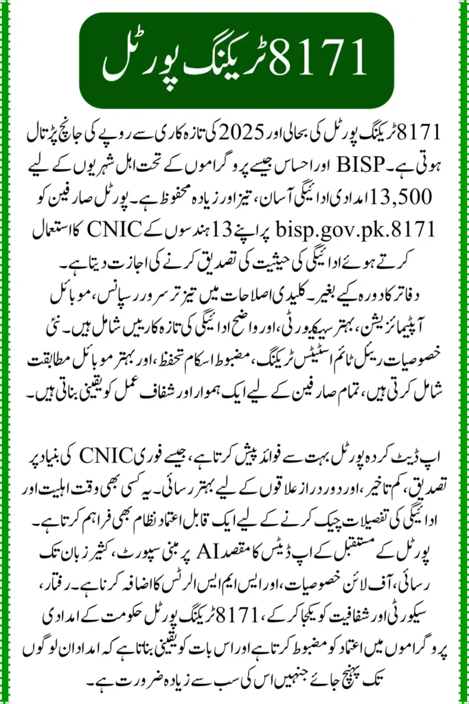 The 8171 Tracking Portal is a government platform that lets eligible citizens check the status of their Rs. 13,500 relief payment under programs like BISP and Ehsaas.