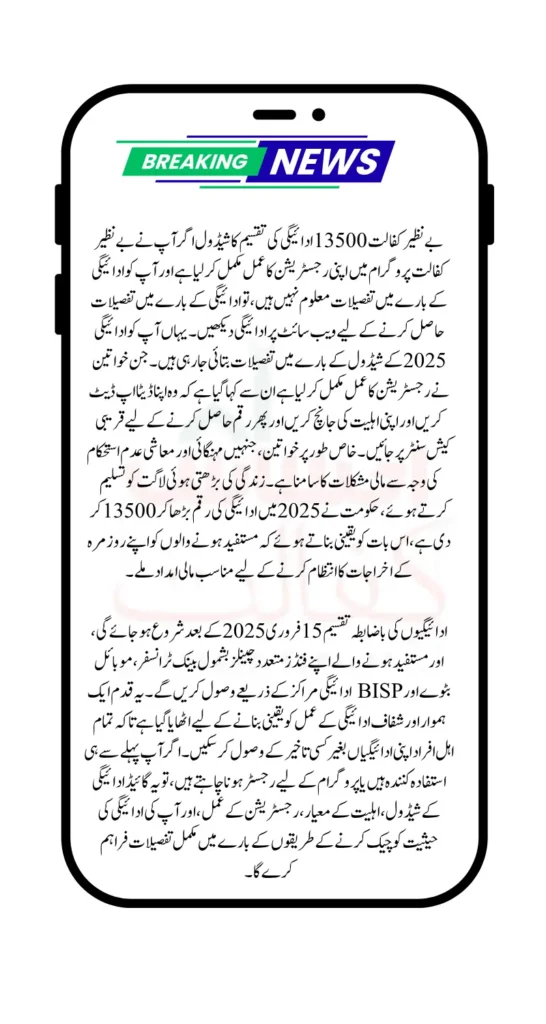 Individuals who are newly eligible for the program will have to complete the registration and verification process before receiving their payments. The eligibility of new beneficiaries is determined based on their Poverty Measurement Tool (PMT) score, which assesses financial need. Only those who successfully register and pass the verification process will qualify to receive the Rs. 13,500 payment. If you are unsure about your eligibility, you can check it by visiting the BISP website or sending an SMS with your CNIC number to 8171.