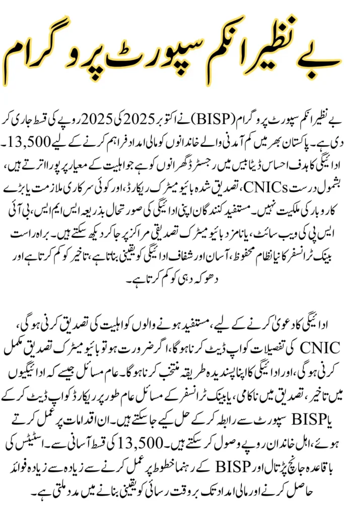 The October 2025 BISP installment of Rs. 13,500 provides vital financial support to low-income families across Pakistan. Eligible households can receive the payment through direct bank transfers or designated BISP camps after completing necessary verification steps. Ensuring updated CNICs and completing biometric verification helps avoid delays and ensures timely receipt of funds.
