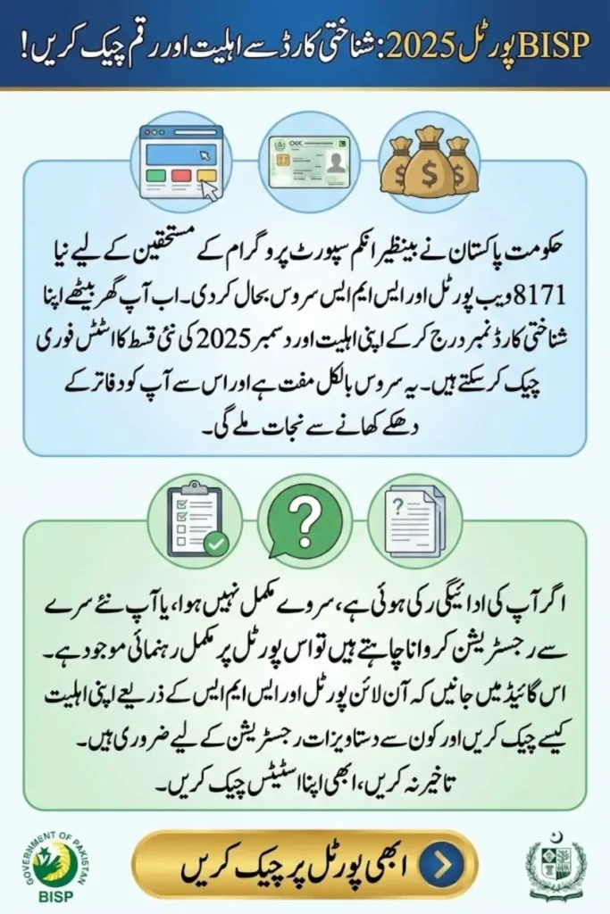 Using the 8171 web portal, beneficiaries can easily check whether they are included in the BISP program, whether their payment has been released, and whether they need to complete the dynamic survey. The portal reduces the need for long queues at BISP offices and provides a simple way for households to stay updated about their financial benefits.