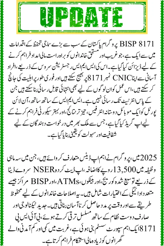 • SMS and online tracking remain active, where you can enter your CNIC via SMS to 8171 or use the portal to check payment and eligibility status
