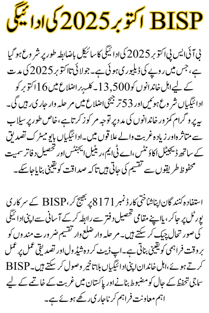 BISP has started the October 2025 payment cycle. Eligible families receive Rs. 13,500 for the July–October 2025 period. Payments began on October 16 in cluster districts and will expand in phases.