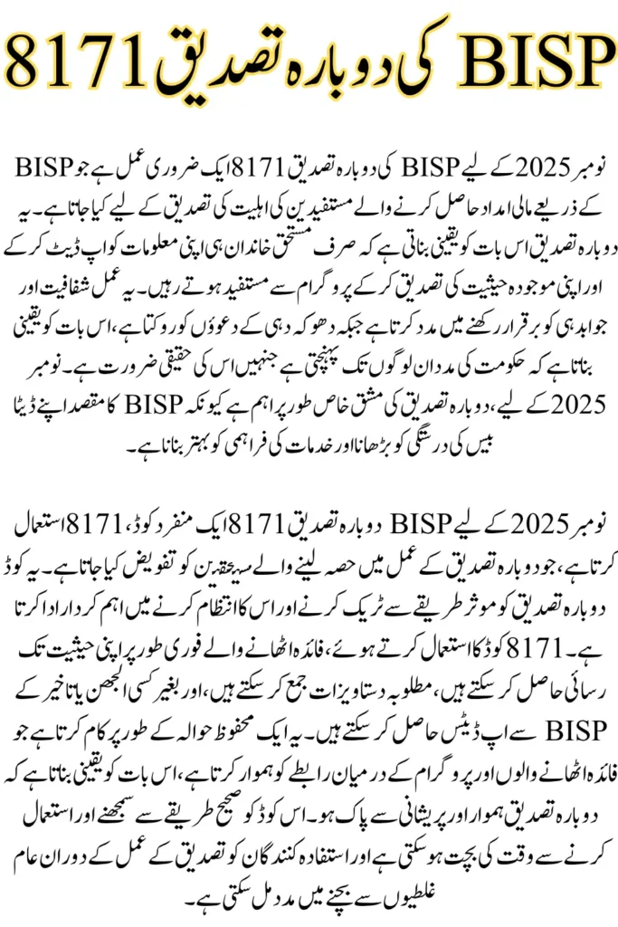BISP Re-Verification 8171 for November 2025 is an essential process conducted by BISP to confirm the eligibility of beneficiaries who receive financial assistance. This re-verification ensures that only deserving families continue to benefit from the program by updating their information and verifying their current status. The process helps maintain transparency and accountability while preventing fraudulent claims, making sure that government support reaches those who genuinely need it. For November 2025, the re-verification exercise is particularly crucial as BISP aims to enhance the accuracy of its database and improve service delivery.