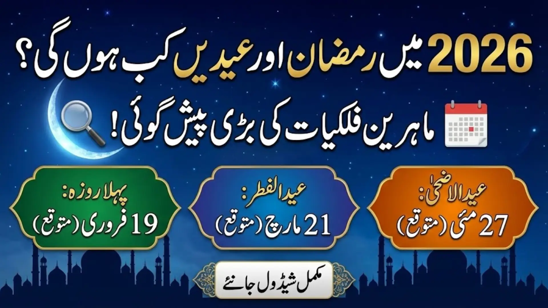 Astronomers have forecast the expected dates for Ramadan, Eid-ul-Fitr, and Eid-ul-Adha 2026 in Pakistan by using scientific moon sighting calculations. These predictions allow individuals, institutions, and government bodies to plan religious, social, and administrative activities while awaiting official confirmation.