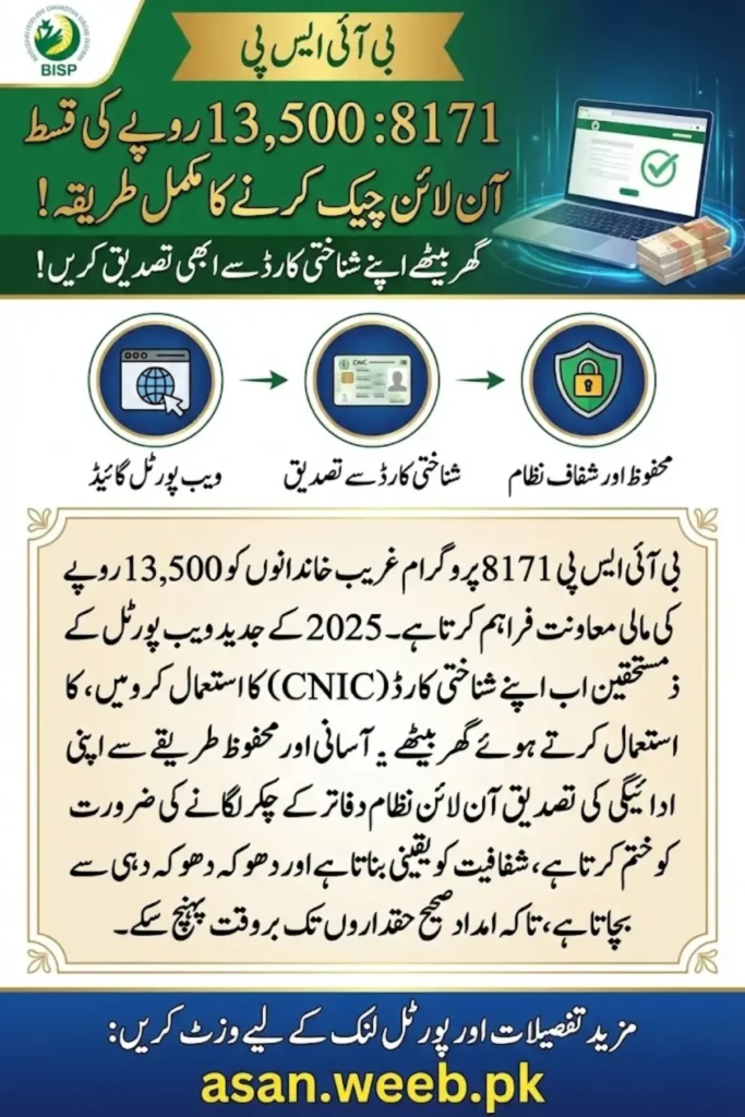 The BISP 8171 web portal allows beneficiaries to confirm whether their PKR 13,500 installment has been disbursed. Online verification is simple, safe, and ensures that the right families receive their payments.