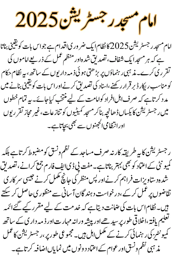 The Imam Masjid Registration Form pdf 2025 process has been introduced to create a more organized, transparent, and reliable system for managing mosque imam appointments across the region. Through this official framework, every imam is verified and documented properly, ensuring that only eligible and qualified individuals are assigned to serve in masajid. This not only strengthens administrative control but also helps maintain the spiritual and social standards expected from imams in their respective communities.