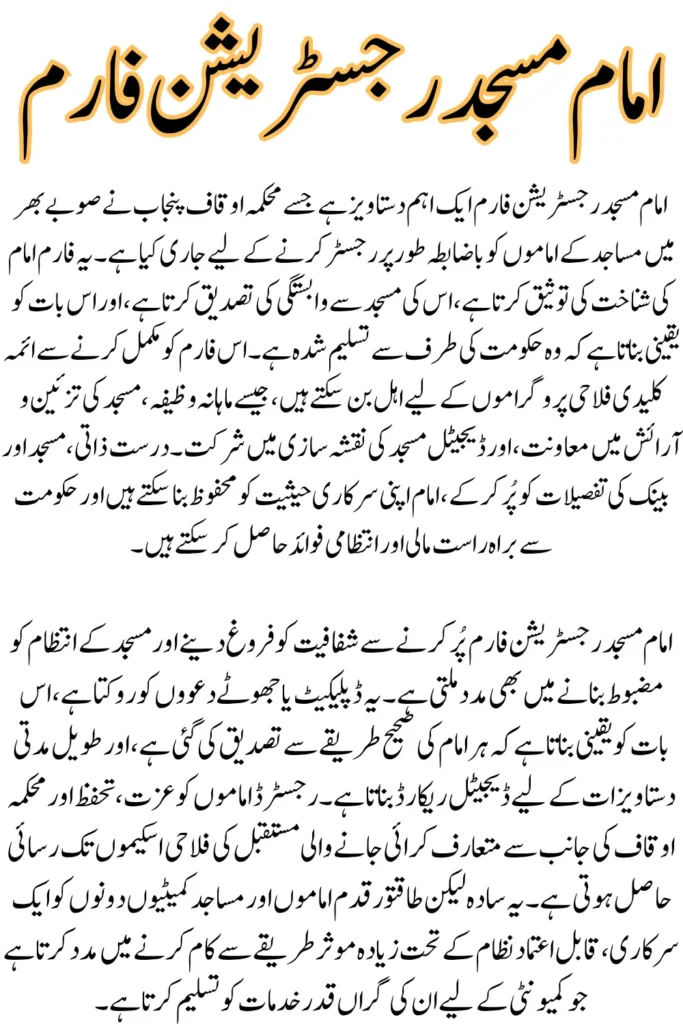 The form also determines eligibility for government welfare schemes, including monthly stipends, mosque development programs, and digital mapping services. By submitting this form, imams gain official status, transparency, and access to important government support systems designed for their welfare.