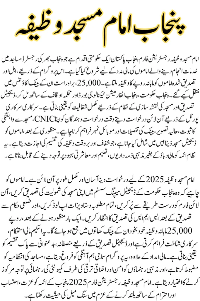 The Imam Masjid Wazifa Registration Form in Punjab is a simple online application for imams to receive a monthly stipend of Rs. 25,000. Eligible imams serving in registered mosques can apply by submitting their CNIC, mosque proof, bank details, and a recent photo. The registration ensures that only verified and active imams benefit from the program, promoting transparency and timely payments.
