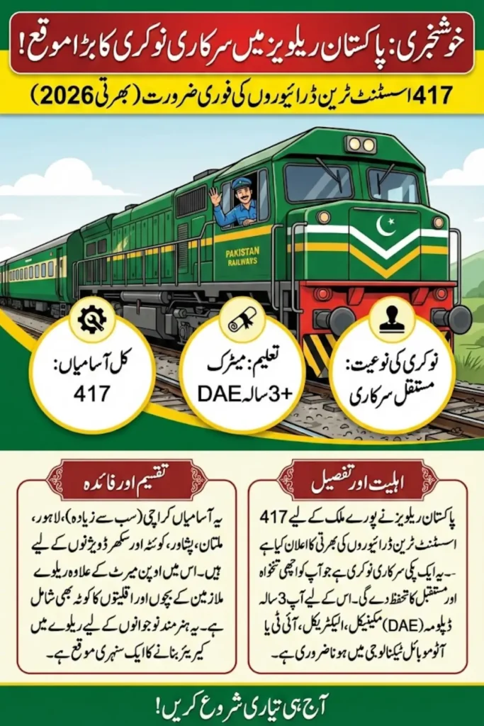 Pakistan Railways has announced a total of 417 assistant train driver vacancies across multiple divisions.