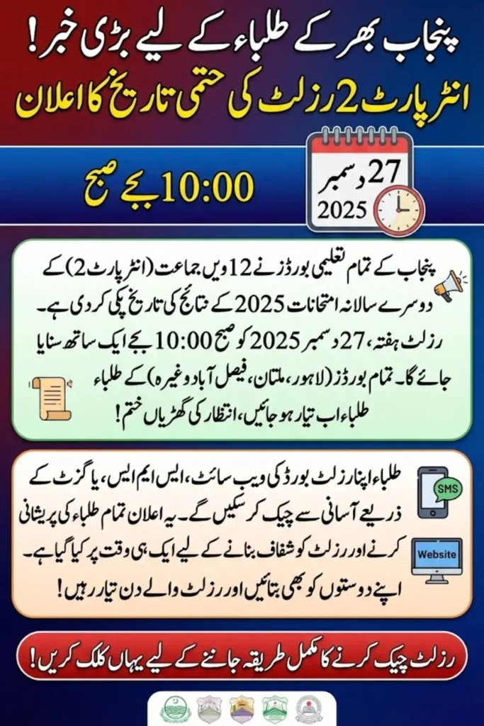 All Boards of Intermediate and Secondary Education across Punjab have officially announced the date and time for the Intermediate Part-II Second Annual Examination 2025 results. All Punjab boards will declare the results simultaneously on Saturday, December 27, at 10:00 am, allowing students to access their outcomes at the same time.