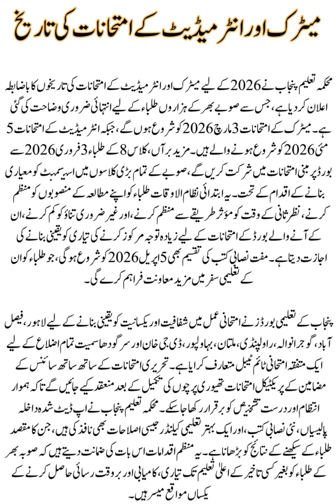 Punjab Matric & Inter Exam Dates 2026 Released; The Punjab Education Department has officially announced the confirmed dates for the Matric and Intermediate examinations for the academic year 2026. This announcement has arrived as welcome news for thousands of students across the province who were waiting for clarity to begin their structured preparation. The department has emphasized that early scheduling will help students plan and reduce unnecessary pressure during the academic cycle. According to the notification, the Matric examinations will begin on March 3 in 2026 and the Intermediate examinations will start on May 5 in 2026, marking an important step toward more organized educational planning.
